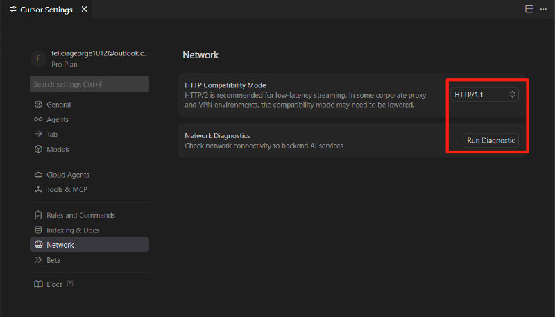 2.4.x,降级到上一个主版本2.3.41,或者版本过老,升级到最新版本切换 网络/HTTP 模式(File/Preference/Cursor Settings),避免 vpn 等软件通讯问题