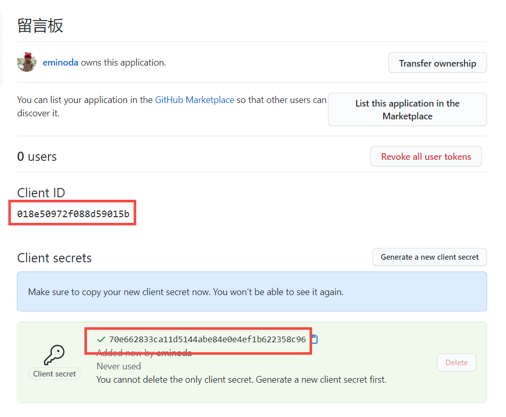保存好 Client ID 和 Client secrets,后续初始化 gitalk 需要